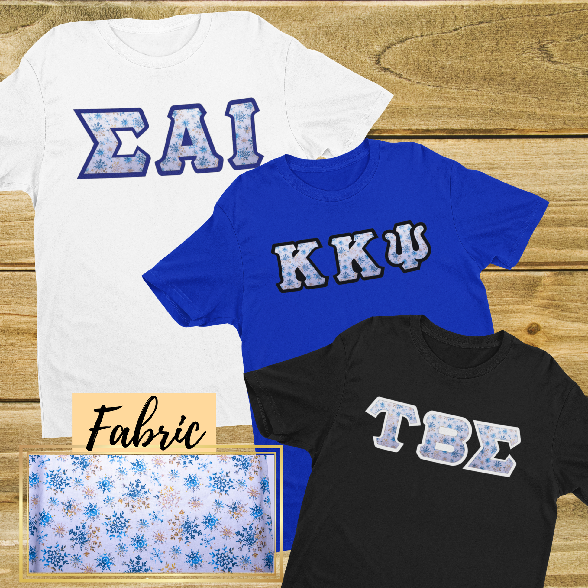 Blue and Gold Snow Flakes Fabric | Double Stitch Greek letters